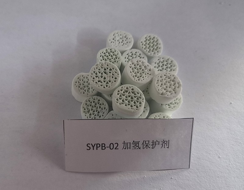 SYPB-02是負(fù)載適量金屬的蜂窩鳥巢保護(hù)劑,此保護(hù)劑是在高孔容大比表面積異形載體上負(fù)載優(yōu)選的活性金屬組元,可對原料中的膠質(zhì)和烯烴以及稠環(huán)芳烴、金屬進(jìn)行轉(zhuǎn)化和加氫飽和,達(dá)到防止壓降上升、延長運(yùn)轉(zhuǎn)周期、脫膠質(zhì)、保護(hù)主催化劑的目的。