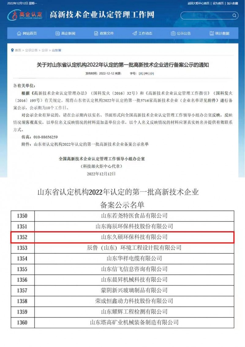 山東久碩環(huán)??萍加邢薰?,成功申請成為高新技術(shù)企業(yè)